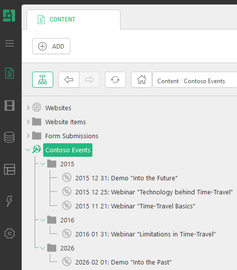 Normally C1 CMS will draw the tree as a list ordered by Title. When defining the data type, you group data by EventDate, so the tree first contains date folders (like ‘yyyy-mm-dd’) and data elements below.