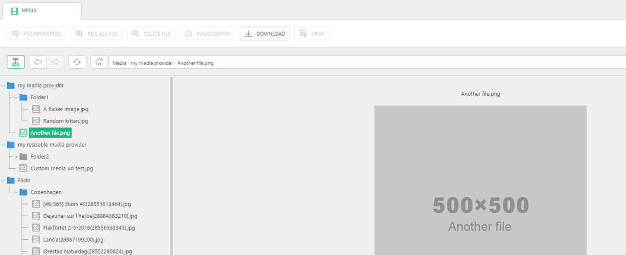 <add storeId="anyOtherId" storeDescription="Resizable media data provider" storeTitle="my resizable media provider" type="myCustomMediaFileProvider.myResizableMediaFileProvider, myCustomMediaFileProvider" name="myResizableMediaFileProvider" />Example 3: Using an API call to get URLs
