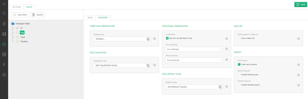 When configuring advanced properties of a data type field, one can choose how the field should be indexed: