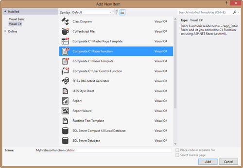 - In the "Add New Item" window, select "C1 CMS Razor Function".