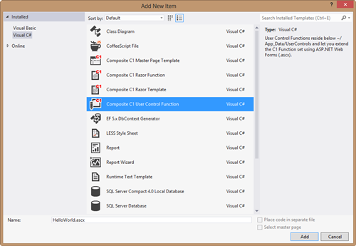 - In the "Add New Item" window, select "C1 CMS User Control Function".