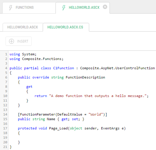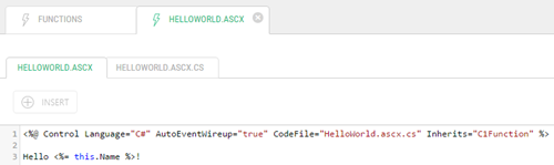 <%@ Control Language="C#" AutoEventWireup="true" CodeFile="HelloWorld.ascx.cs" Inherits="C1Function" %> Hello <%= this.Name %>!