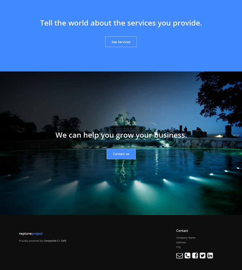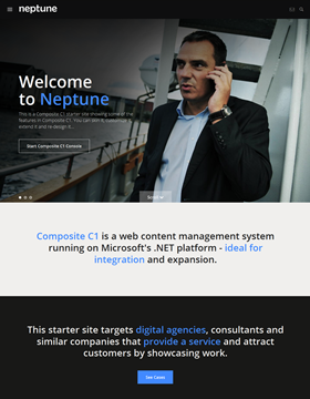 The Neptune is a starter site that shows some of the features in C1 CMS and targets digital agencies, consultants and similar companies, which provide services and attract customers by showcasing work.